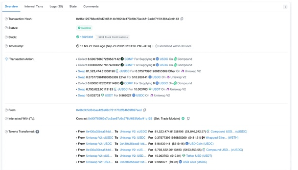在MEV机器人被利用之前,它已经预先运行了一笔交易,该交易从仅仅11美元的USDT中获利了15万美元。该交易是一个180万美元的系列兑换,从cUSD 兑换成WETH再到USDC。由于交易过程中的价格下跌,180万美元的SWAP只换来了约500美元的USDC。