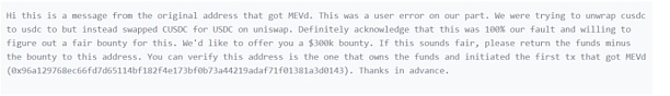 MEV机器人的所有者给攻击者发了一条信息,“祝贺”他们发现了 “难以发现”的漏洞,并为他们提供了20%的赏金以换取暂时不采取法律行动的”承诺“。该”承诺“的最后生效期限是北京时间2022年9月29日早7点59分。