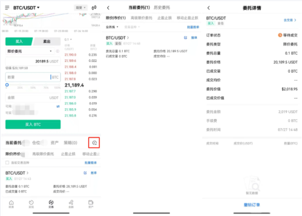 03进入币对交易页面后,在买入界面,选择买入方式,输入买入价格、数量/金额,点击买入BTC即可。买入方式通常为限价委托,可以设置理想的价格进行购买。下单成功还未成交时,可看到委托单信息并可随时撤单。