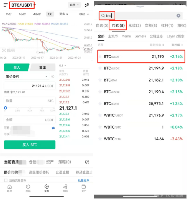 02在首页下方点击交易,进入交易页面。点击页面上方交易对,在搜索框输入想要购买的币种BTC,选择币币,点击相应币对BTC/USDT。(若已在当前币对交易页面,可忽略此步骤)
