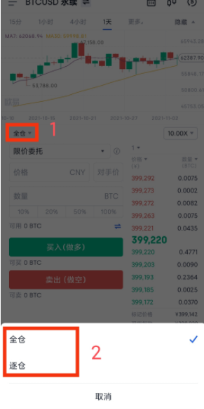 3、选择全仓或逐仓。全仓指账户所有的仓位共用保证金,不同仓位的盈亏可以互相抵消;逐仓指各仓位的风险与收益独立,各仓位的保证金与盈亏均单独核算。