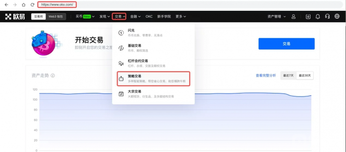 1)打开欧易官网,点击【交易】-【策略交易】,点击【现货网格】,进入【策略选择】页面,在列表中选择【天地网格】。填入【投入金额】,点击【创建策略】。