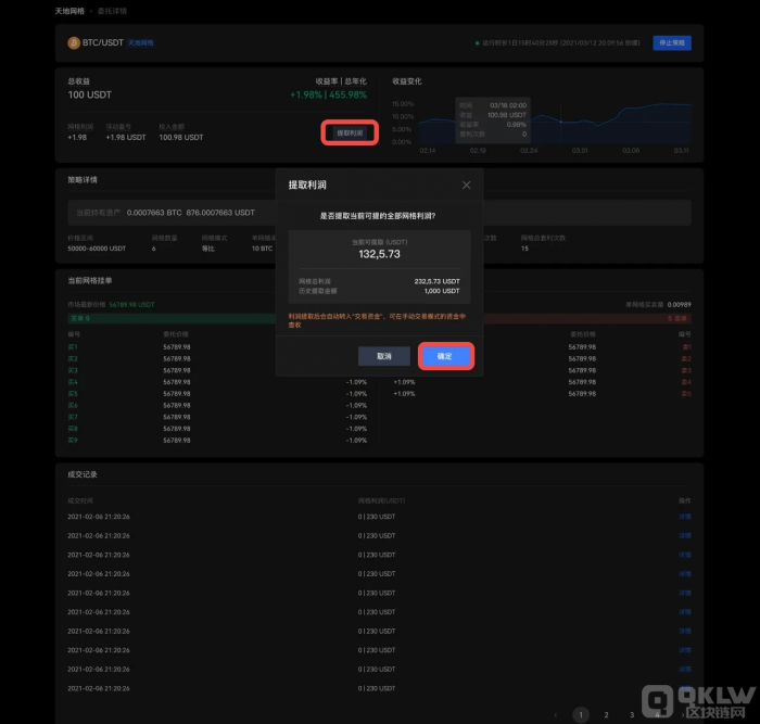 4)点击【详情】页面中的【提取利润】,在弹出页面二次确认后,可提取利润,无论是否停止策略,均可提取。