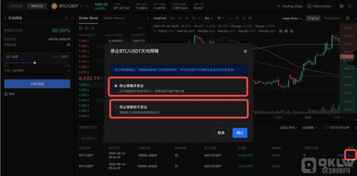 5)用户停止天地网格时,可在持仓页面,点击【停止】,在对话框中,根据是否继续持有BTC,选择【停止策略并卖出】或【停止策略但不卖出】两个选项。