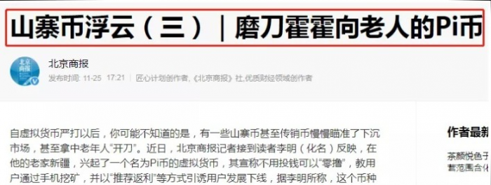 关于Pi币(π、派币),网上关于它的曝光太多了,仅官媒就曝光了多次。最近,北京商报又对它进行了曝光!