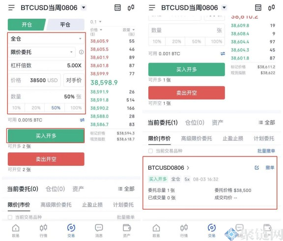 3、选择账户模式、委托类型,输入价格、数量,点击买入开多(看涨)或卖出开空(看空)。未成交的委托挂单可单击撤单撤销委托。