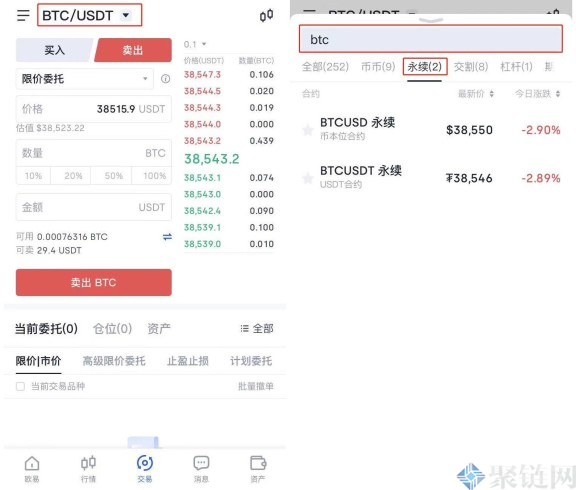 2、在交易页面点击币对右侧的下拉按钮,在搜索框输入币种,在保证金交易处选择永续,选择币种对应的U本位合约。