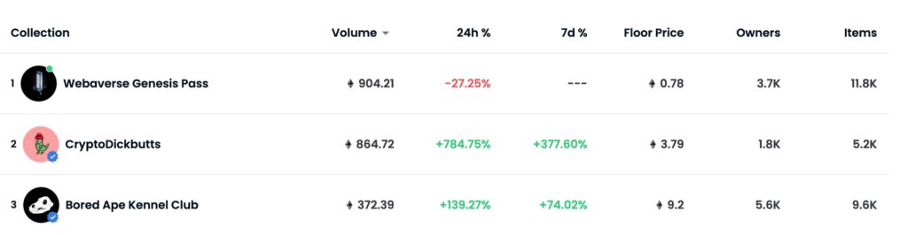 热络的交易也使CryptoDickbutts登上当天交易排名榜第二,高于BAYC、Cryptopunks、Moonbirds…等一众蓝筹NFT。