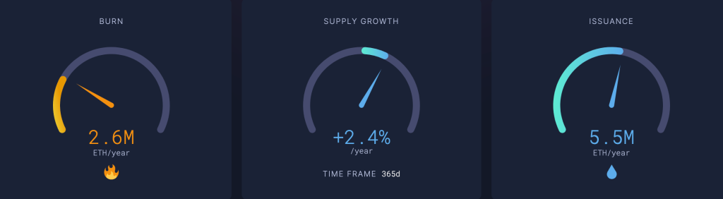 根据ultrasound.money,365天以来烧毁了约260万个以太币,基于PoW共识发行了550万个以太币,整体来说,为以太币总流通量带来2.4%的年增幅。