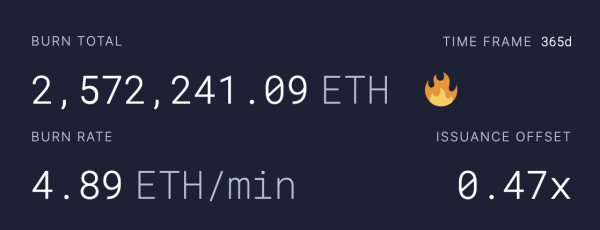 365天以来,每分钟烧毁4.89个以太币被烧毁,抵销发行0.47x。