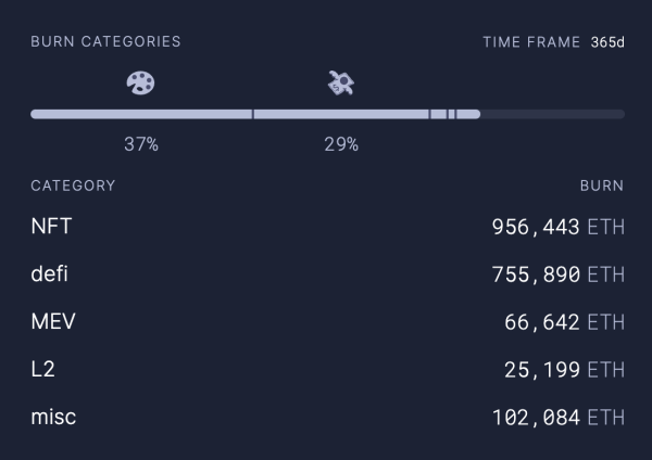 在不同的类型交易中,NFT活动所销毁的以太币,胜过DeFi活动,也彰显了过去一年NFT的兴盛与DeFi的降温,其次为套利活动MEV,以及其他活动。