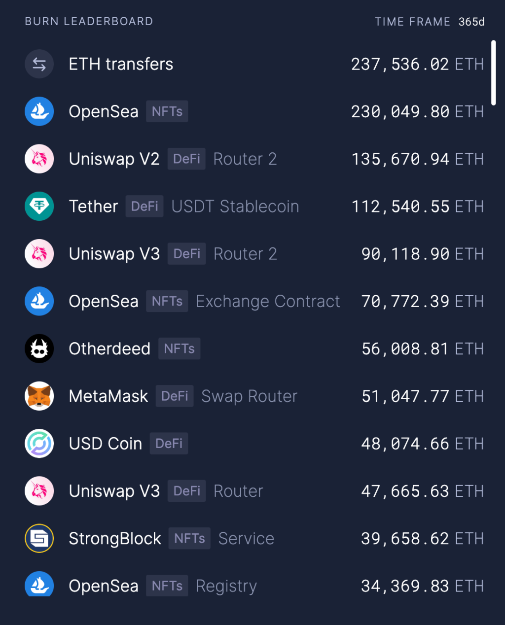 整体来说,以太币的传输带来的烧毁量最大,接着就是以太坊最大宗的NFT市场OpenSea,DeFi兑币协议Uniswap烧毁量则是几乎只有OpenSea的一半。
