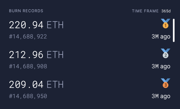 最高烧毁量的区块,前三名都集中在三个月前,也就是五月。第一名为区块#14688922,共烧毁了220个ETH。