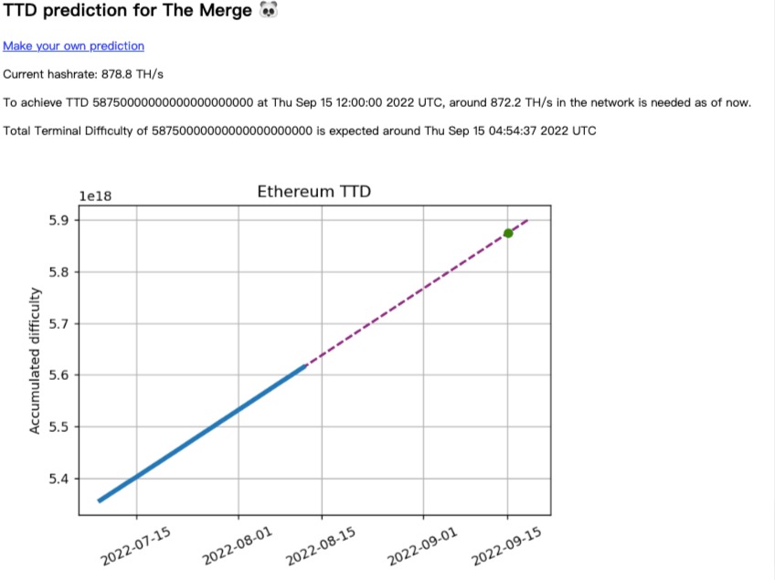 bordel.wtf数据显示,目前预计以太坊主网将在UTC时间9月15日4:54(北京时间9/15中午12:54)左右达到TTD,激活合并。此前,以太坊核心开发者Tim Beiko曾预告,主网合并预计将在9月19日那一周启动。