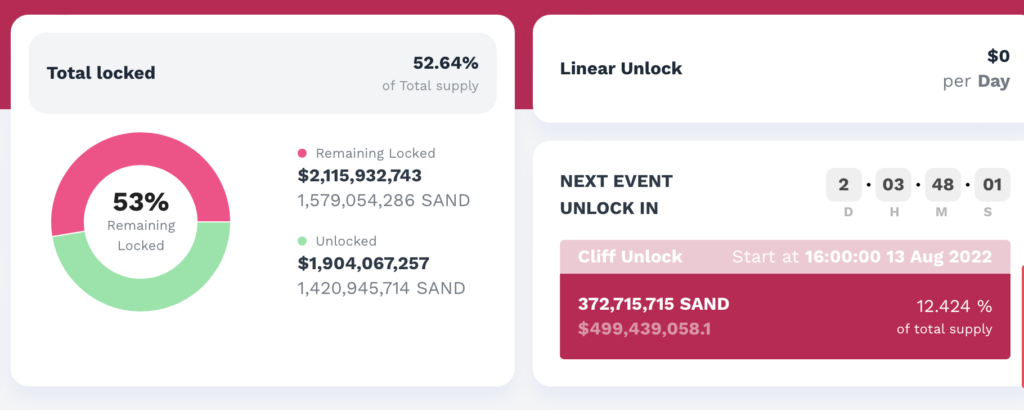 The Sandbox采非线性解锁,在2025年2月完全解锁前尚有1,579,054,286枚未解锁。下阶段解锁日期在2023年2月13日。