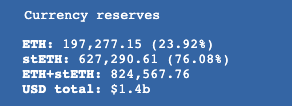 当前Curve stETH/ETH流动性池的比例逐渐倾斜,stETH比例高达76%,1ETH可换到1.0378stETH。