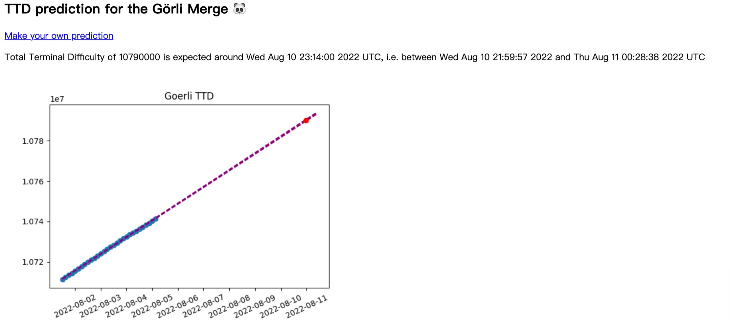 接下来将仅剩最后的Goerli/Prater合并步骤,即执行层的Paris升级,以完成从PoW到PoS的过渡,以太坊基金会此前预计将在到达Goerli测试网上所设定的最终目标难度(Terminal Total Difficulty,TTD)10,790,000时启动升级,将在UTC时间2022年8月6日至12日之间进行。今日,以太坊核心开发者Tim Beiko进一步确认Goerli合并计划将在8月10日进行。