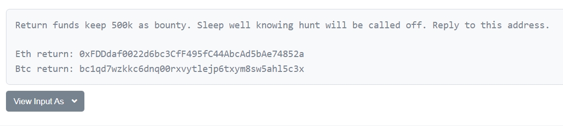 据Etherscan数据,X通过该交易发送讯息指出请返还资金,可保留50万美元作为赏金,以太坊返还地址为0xFDDdaf0022d6bc3CfF495fC44AbcAd5bAe74852a,比特币返还地址为bc1qd7wzkkc6dnq00rxvytlejp6txym8sw5ahl5c3x。