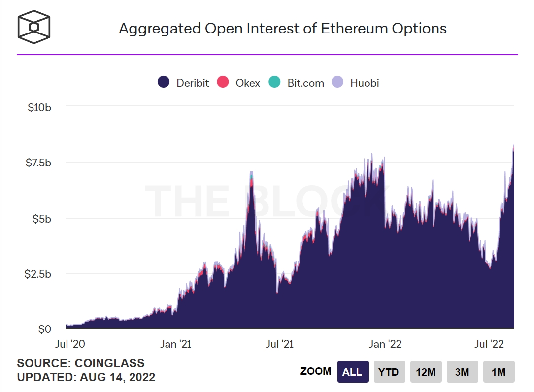 不过据The Block数据显示,以太坊期权未平仓合约总额上周已突破80亿美元,首度超越比特币期权未平仓合约总额,高于7月29日时的70亿美元,并创下历史新高。