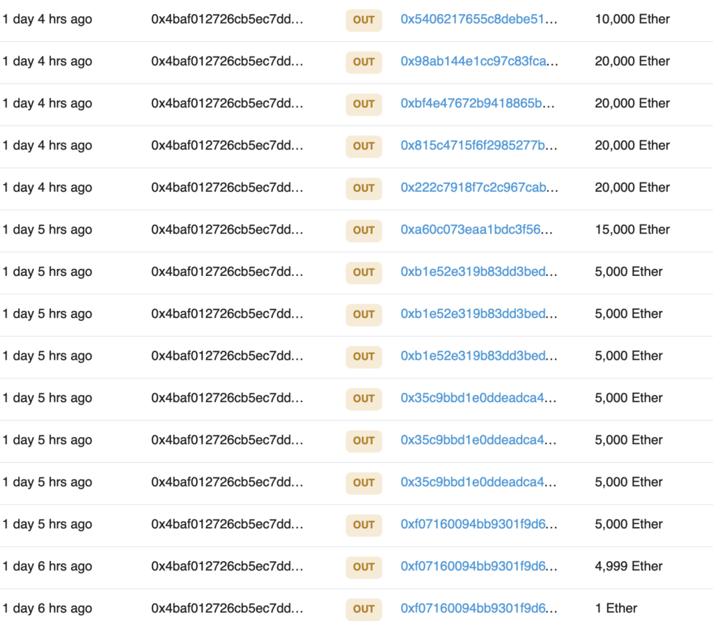币圈子(120BTC.com)讯:根据链上纪录,已有902天未动作的以太坊巨鲸钱包地址0x4bAf012726CB5EC7Dda57Bc2770798A38100C44d在昨(14)日将钱包内145,000枚ETH(目前总价值约2.9亿美元)拆开发送到9个新钱包地址。