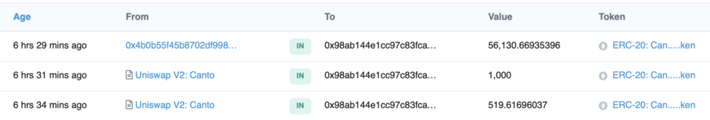 此名巨鲸将14.5万枚ETH发送到9个新创钱包,同一动作都在6小时前在Uniswap V2兑换了少量新创代币Canto(Canto Utility Token),而9个钱包之一还被Canto项目钱包空投了5万多枚Canto。