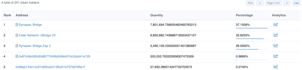 代币Canto(Canto Utility Token)约在截稿时间8小时前于以太坊上新创,创建起初就将绝大部分流动性20,098,437枚送往跨链桥协议cBridge与Synapse;剩余的901,562.9枚送往Uniswap提供流动性。目前该代币Canto持有者有241名,与上述以太坊巨鲸关系目前尚未得知。