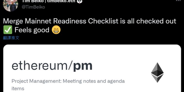 以太坊主网合并预计最快将在9月15日启动,从工作量证明(PoW)过渡至权益证明(PoS)机制。以太坊核心开发者Tim Beiko今日在推特上分享Github上的主网合并准备事项检查表宣布,主网合并准备事项已全部完成。