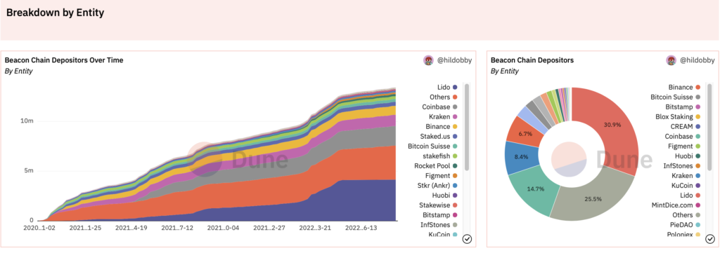 上述由云服务商托管的节点,主要来自大型中心化单位或交易所,拿以太坊为例,包括Lido、Coinbase、Kraken、Binance就管理超过66%的信标链验证节点,而其中大部分都交由云服务商托管。