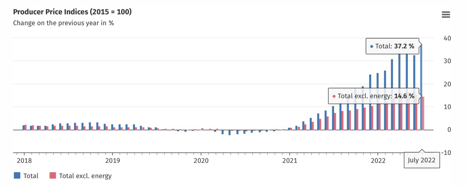 至于这波快速暴跌的原因,或与身为欧盟经济领头羊德国稍早刚出炉的经济数据有关。德国联邦统计局(Destatis)今日公布最新数据指出:2022年7月工业产品生产者物价指数(PPI)年增37.2%、创史上最大年升幅,主要是受到能源价格大涨的带动。