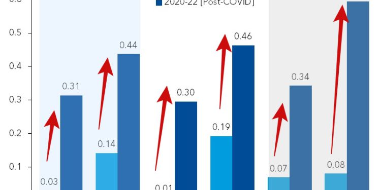 随着亚洲投资人投入市场,比特币和印度、越南、泰国各国股市在2017-2019年,与2020-2022年两个时间段比较下,回报率和波动相关性以惊人的倍数上升。