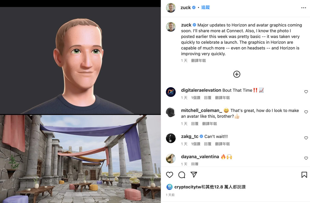 昨日(20)日扎克伯格为挽回颜面,在个人IG再次发表了画质升级版的Horizon Worlds和虚拟替身。