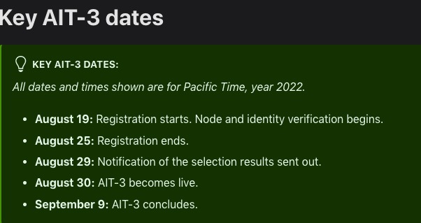 昨(20)日官方再公告,揭示激励测试网3(AIT-3)的注册、时间表和激励标准等细节。团队表示,AIT-3带来了主网的最后一个主要交付功能:链上治理和升级。为了反映主网启动的现实环境,AIT-3参与者的数量将比照AIT-2,大约有225名参与者。