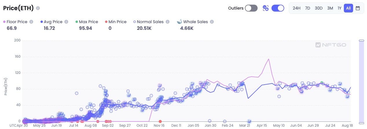 冯德伦购入无聊猿正值该项目地板价创8个月新低之际。NFT.GO数据显示,无聊猿地板价目前已来到66.9ETH(现约10.8万美元),创下今年1月3号以来的新低,较今年5月初153.7ETH(约合24.8万美元)的历史高点已腰斩56%。
