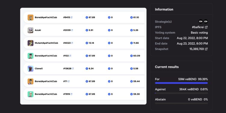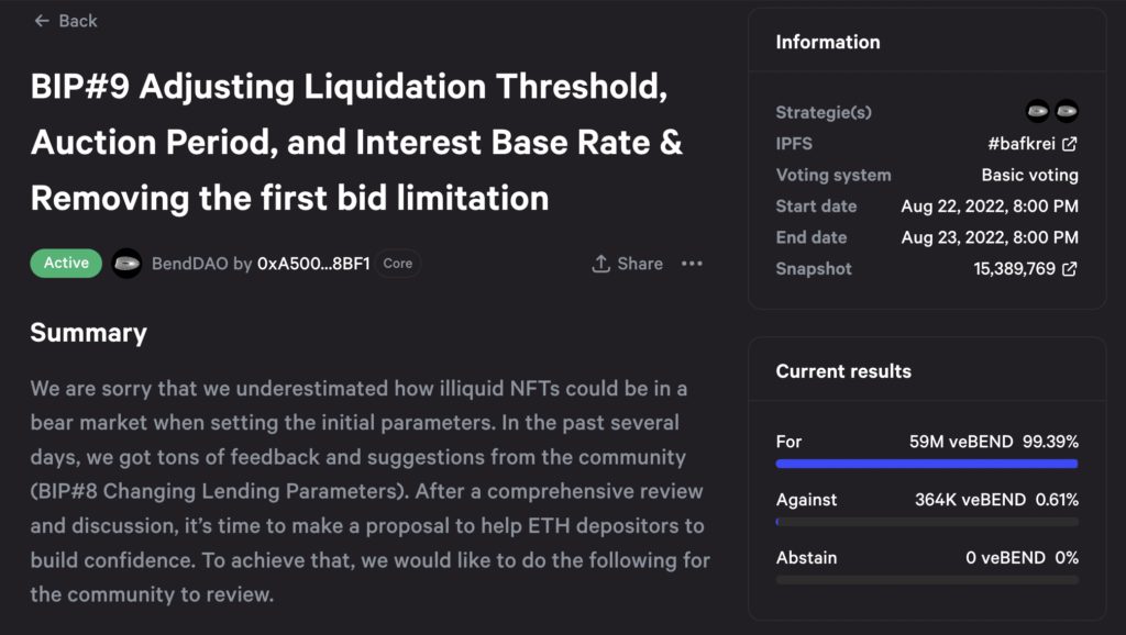 在NFT抵押借贷平台BendDAO上大量蓝筹NFT面临清算风险、众多用户提领他们的ETH资产之际,BendDAO共同创办人@CodeInCoffee昨(22)晚发推表示,提案BIP#9投票已经正式开启,本次投票时间只有24小时,旨在修改部分协议参数来解决流动性危机。
