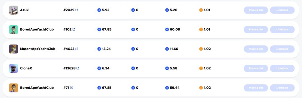 据悉,最近三天内已有28个无聊猿(BAYC)和48个变异猿(MAYC)遭清算,当前还有4个BAYC、7个MAYC,以及其他蓝筹如:Azuki、Doodles、CloneX…正在进行拍卖。(当健康系数小于1时,将启动清算)
