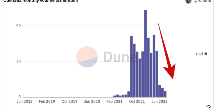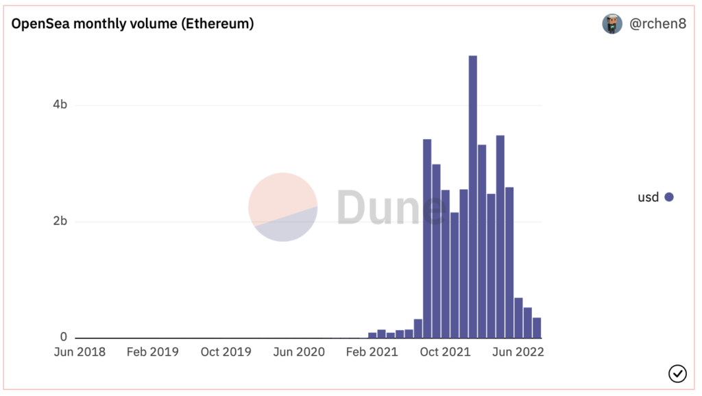 根据Duneanalytics数据显示,NFT市场龙头OpenSea本月至今以太坊总交易金额为3.54亿美元,比起今年巅峰1月交易金额48.5亿美元,萎缩到仅有其约7%。而8月估计将成为4月后第4个交易总金额连续下行的月份。