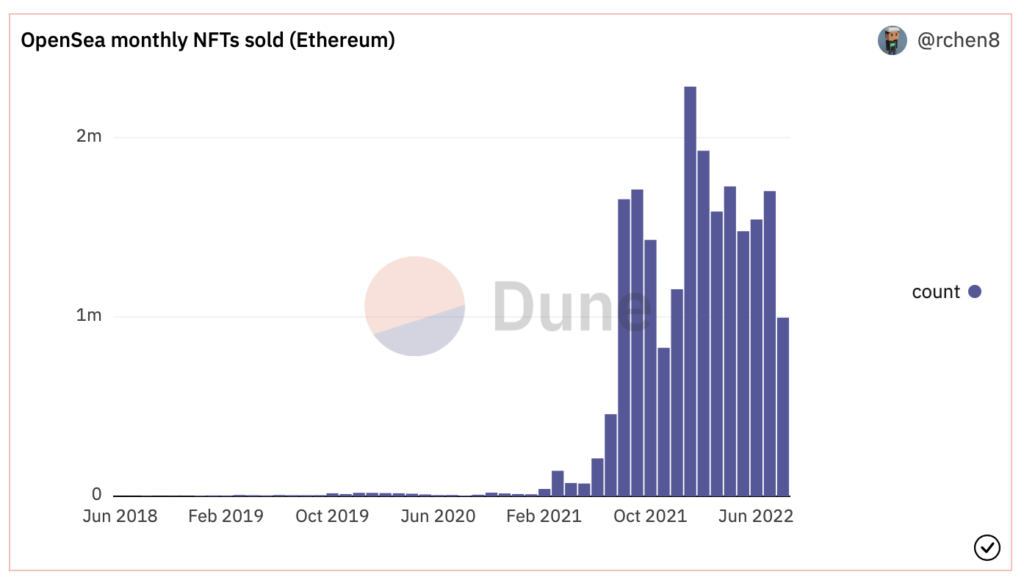从Duneanalytics的数据能观测出,OpenSea在以太坊上的NFT售出量并不像交易金额滑落幅度如此大。7月份的以太坊NFT售出量达170万个,本月至今也逼近100万个,比照今年售出量最高的1月则为228万个。