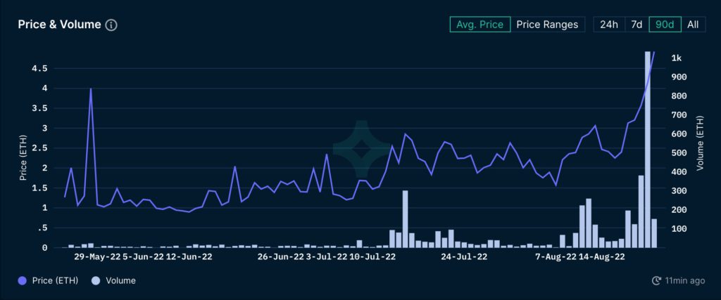币圈子(120BTC.com)讯:整体NFT市场本月来到近一年来的历史低点,但此时却有一项目逆势上涨,那就是过往发展过程一波三折的胖企鹅NFT「Pudgy Penguins」。根据分析数据,该系列于Opensea过去24小时内交易量超过800ETH(价值约124万美元),仅次于BAYC系列;此外其地板价也飙升至3.8ETH创下历史新高,近一周暴涨超60%。