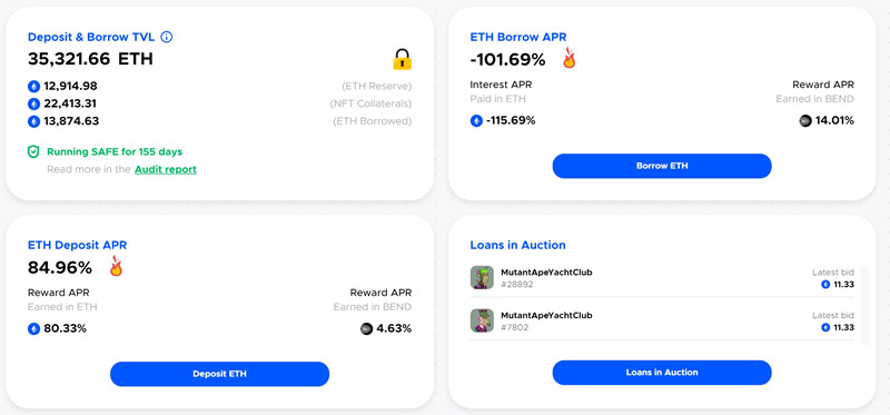 币圈子(120BTC.com)讯:在NFT抵押借贷平台BendDAO上的大量蓝筹NFT面临清算风险危机被市场广泛关注之后,据BendDAO官网,该平台上的以太坊借贷利率已升至101.69%,以太坊存款利率则达到84.96%,而DefiLlama数据显示,这几天BendDAO的ETH经常性呈现净流出。