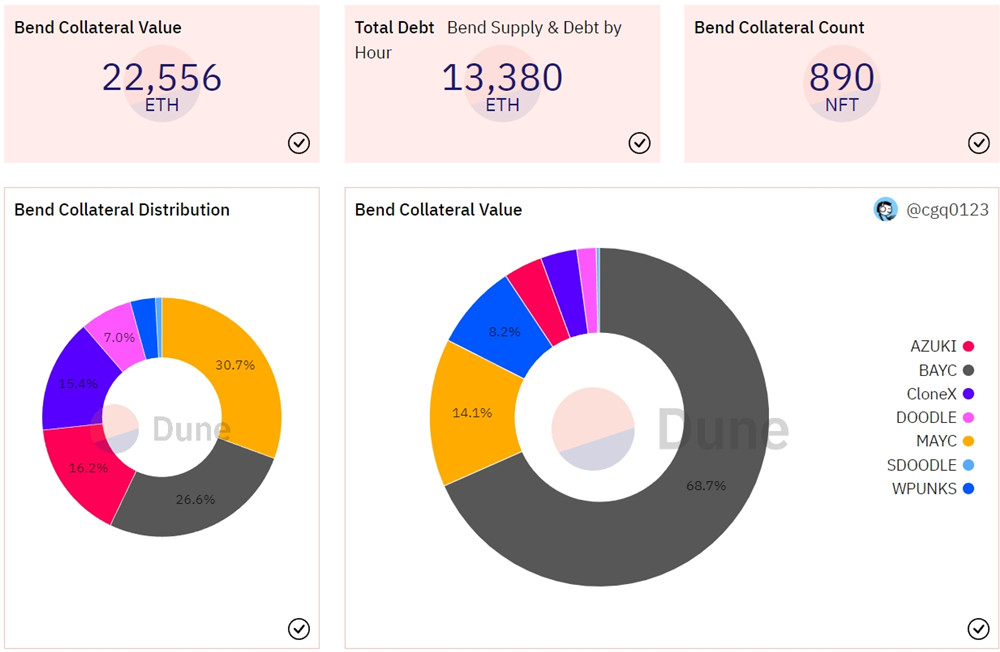 BendDAO当前抵押NFT数量为890个,其中抵押数量排名前三的NFT系列,分别是MAYC(267个,占比30.7%)、BAYC(231个,占比26.6%)、Azuki(141个,占比16.2%)。