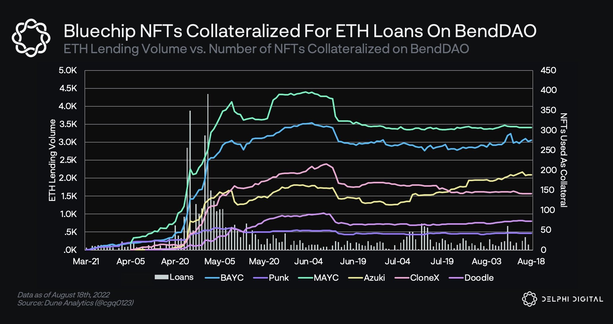 数位资产分析公司Delphi Digital昨日表示:BendDAO自8月14日以来已清算了12个用于ETH贷款的NFT抵押品。目前有价值30,641ETH(约5,022万美元)的1,028个NFT作为抵押品存放在该平台上。
