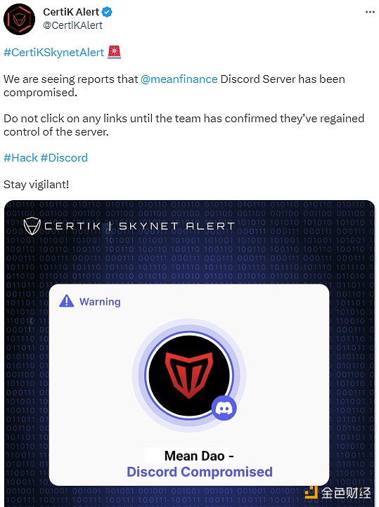 据CertiK监测,Mean DAO项目Discord服务器遭到攻击。在团队重获其服务器的控制权之前,请勿点击任何链接。