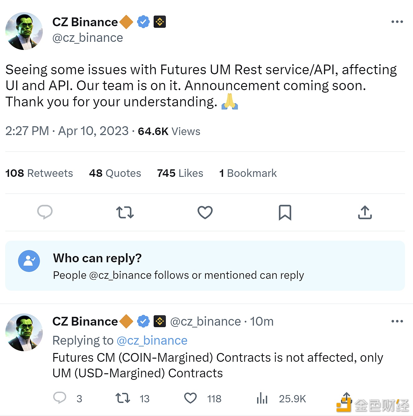 4月10日消息,币安首席执行官赵长鹏发推称:“Binance U本位期货合约服务/API出现问题,币安团队正在修复,相关公告即将发布。”