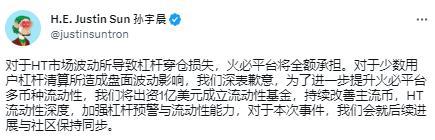 “对于HT市场波动所导致杠杆穿仓损失,火必平台将全额承担。对于少数用户杠杆清算所造成盘面波动影响,我们深表歉意。”