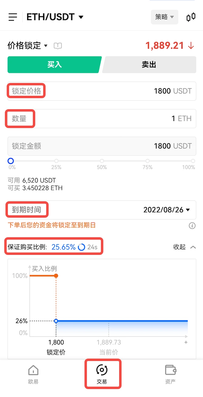 如下图中ETH/USDT买入为例,使用【价格锁定】时,填入锁定价格1800、数量1个ETH、到期时间2022/08/26,输入这些参数后,在这30秒的倒计时里,系统会自动计算出【保证购买比例】,如本次保证购买比例是25.65%,即到8月26号16点交割时间后,当价格高于1800时,也能买到25.65%*1=0.2565个ETH;如果价格小于等于1800,则能按照1800全部成交。
