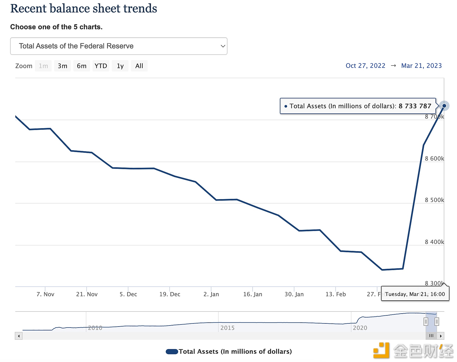 据美联储官网最新数据显示,截至3月21日,美联储资产负债表规模为8.733万亿美元,较3月15日的8.69万亿美元增加约430亿美元。 此前报道,3月17日,美联储资产负债表从3月8日的8.39万亿美元跃升至3月15日的8.69万亿美元,为去年11月以来的最高水平。