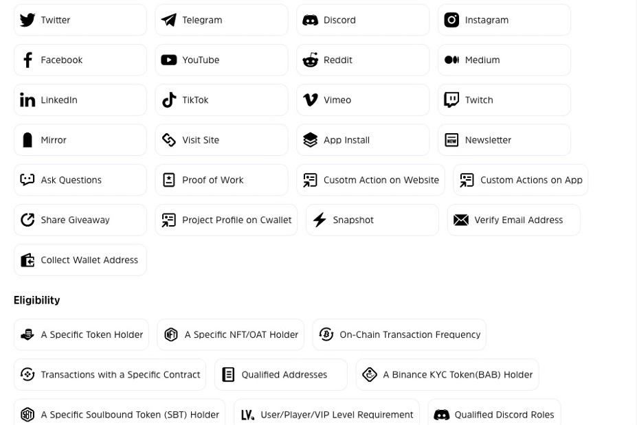 当前,Giveaway抽奖是各个Web3项目引流的首选方式,包括Web3羊毛党通常会在不同的赏金平台肝任务,这样不仅能活跃社区也能吸引更多用户。真实的用户涌入及流量增长使得Gleam等各类任务平台应运而生,但各家在功能上存在不同程度的差异。Cwallet定位于工具,面向Web2品牌及Web3社区推出了Web2.5的全功能Cwallet Giveaway。项目方可轻松在数分钟内创建抽奖活动,自定义抽奖主题、奖品类型、全品类任务要求等相关信息。