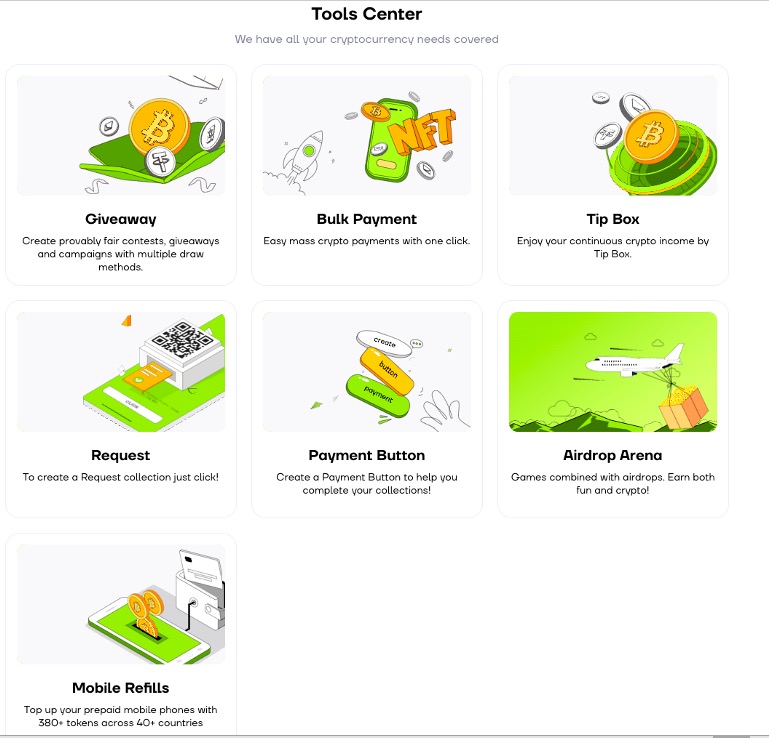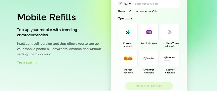 Mobile Refill话费充值:满足各地域用户日常所需,可快速用加密货币实现移动充值。目前已支持40多个国家的任意号码和200多种运营商。