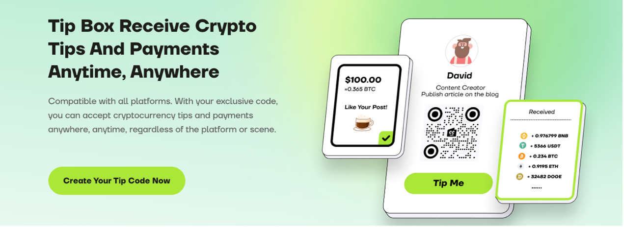 Tipbox打赏码:免费的收款码可让用户无需提供冗长的区块链地址,灵活用于内容打赏、薪酬接收、网上购物、转账等;