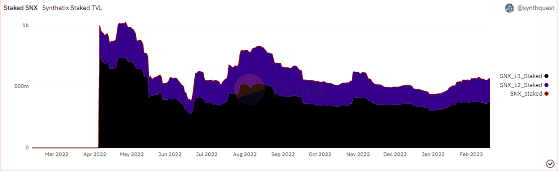 据Dune 数据显示,撰写本文时,SNX 总量为约 3.14 亿,L1 与 L2 总计的质押率约为 67.37%,而在 Curve 上提供流动性并可以进行原子交换的 sUSD、sETH、sBTC(包括 L1 和 L2)分别约有 3690 万枚、19180 枚、576.7 枚,按照撰写本文时的 SNX 以及比特币、以太坊价格计算,这些提供流动性的 sTGate.ion 总价值约为 8340.48 万美元,质押的 SNX 总价值约为 5.589 亿美元,可用于原子交换的 sTGate.ion 总价值不到质押 SNX 总价值的 15%。